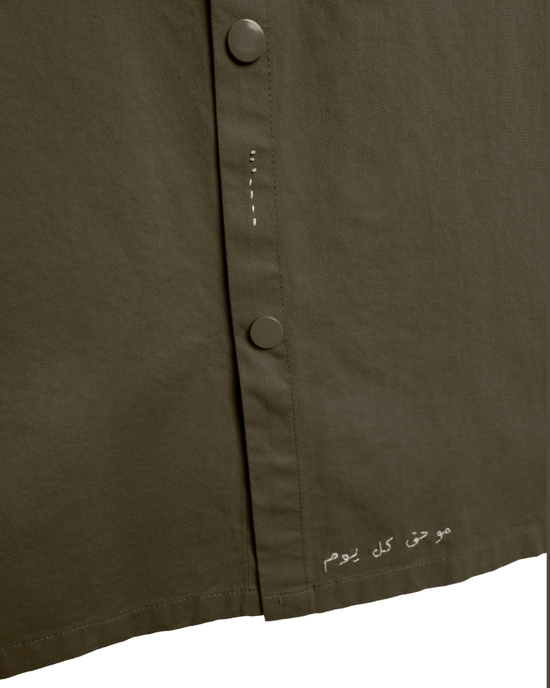 Delicate Arabic embroidery near the hem reads "مو ØÙ‚ كل يوم" — not for everyday — a quiet affirmation of presence and identity.