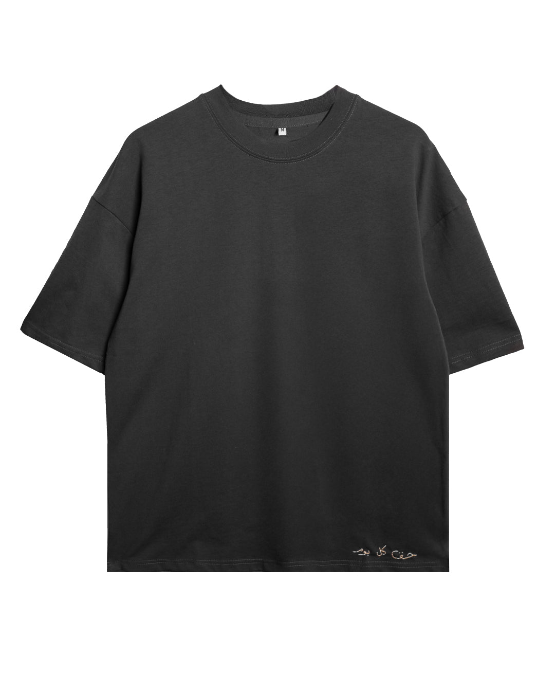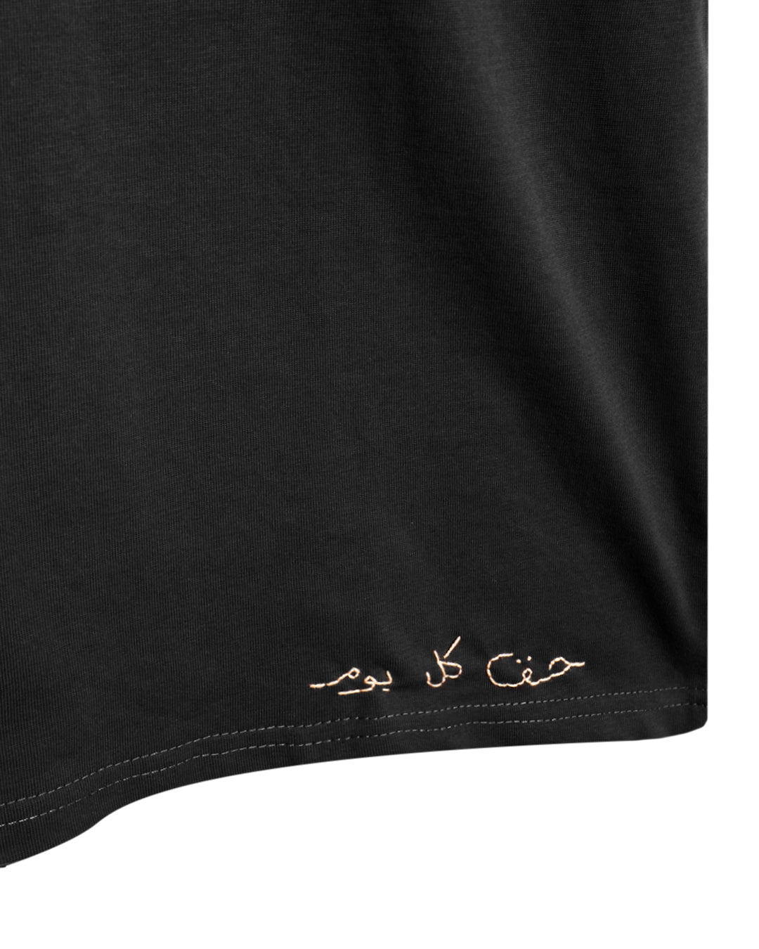 Subtle Arabic embroidery at the hem reads "حق كل يوم" — For everyday — a soft reminder of selfhood and grounded identity.