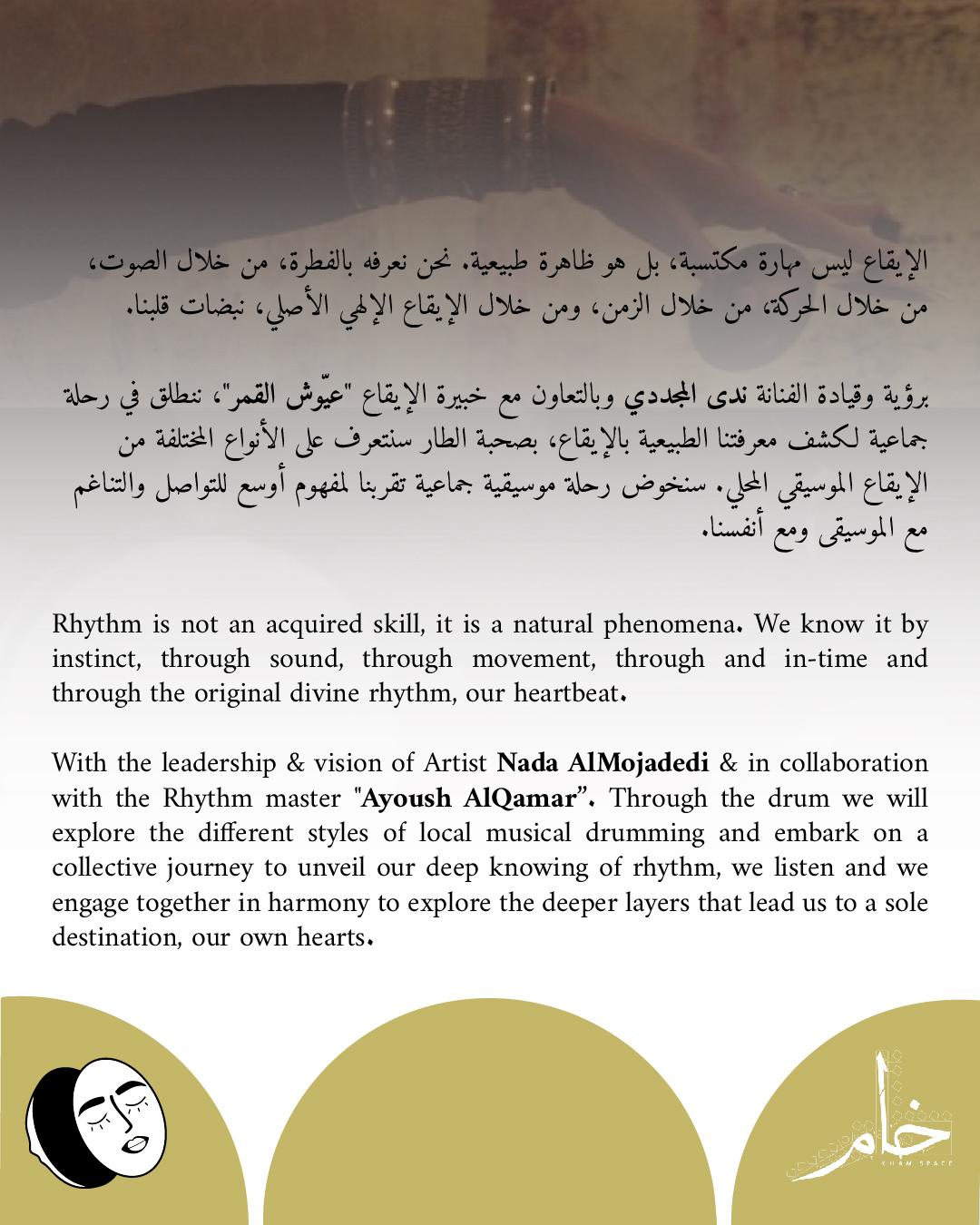 بقيادة خبيرة الإيقاع عيّوش القمر، ندعوكم للانطلاق معنا في رحلة جماعية لاكتشاف هذا الارتباط العميق والبديهي. من خلال الإصغاء، والحركة، والتفاعل المشترك، نستكشف الإيقاع كمسار يقودنا إلى التناغم، مع بعضنا البعض، ومع ذواتنا.