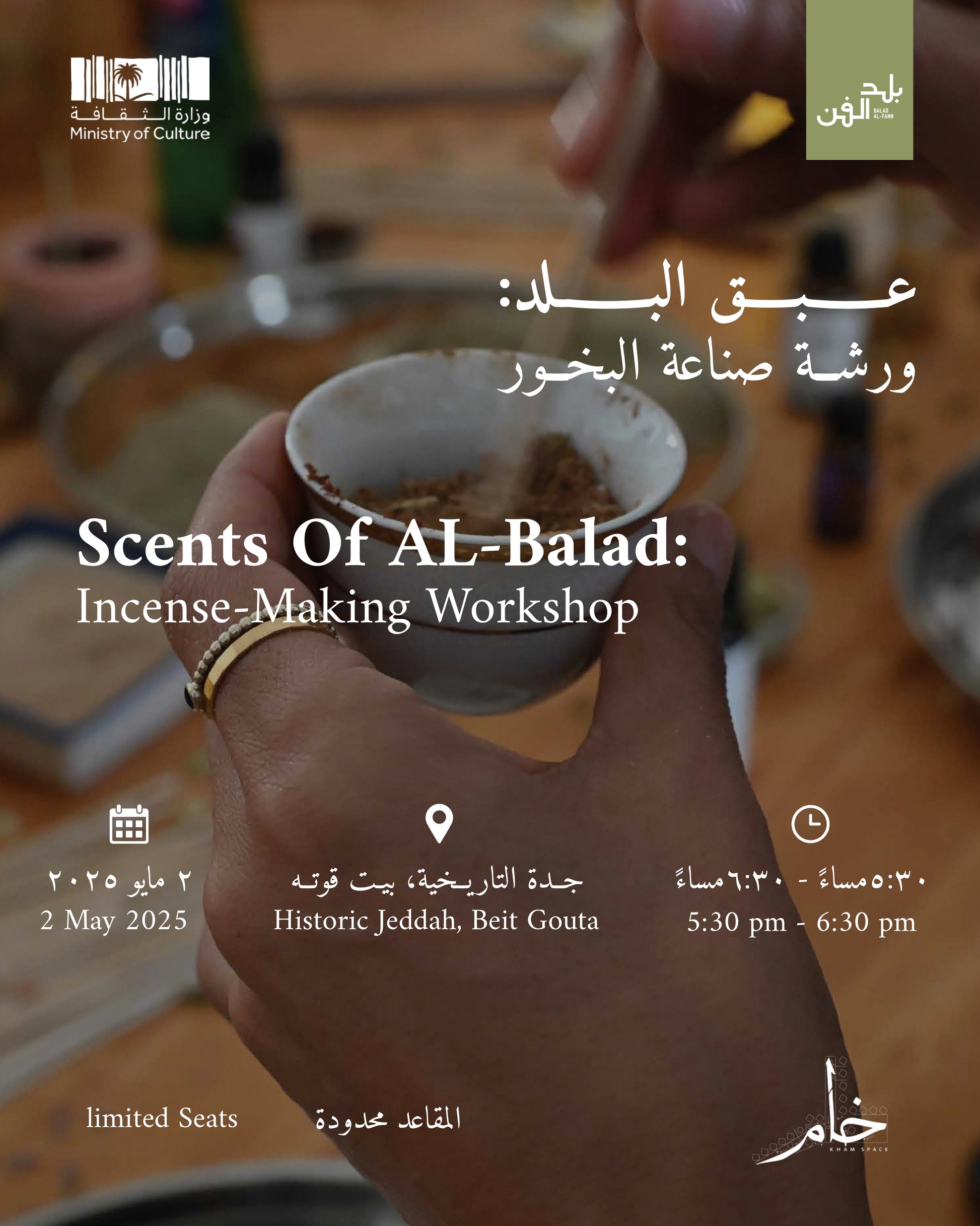 Join Raghad Fathaddin and a local Al-Balad herbalist "Attar" for an intimate incense-making experience that revives memories through scent. In the heart of Al-Balad, participants will explore the traditional art of blending natural ingredients to create their own handmade incense. Guided by stories, aromas, and ancestral wisdom, this sensory journey reconnects us with heritage, culture, and the deep-rooted spirit of place.