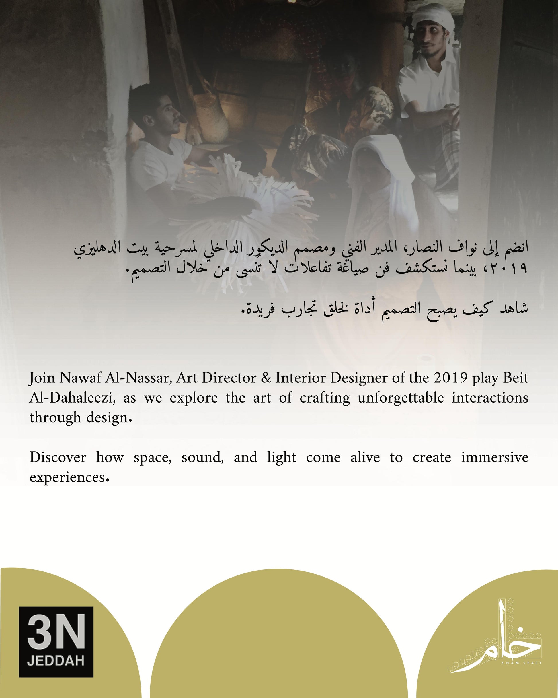 Join Nawaf Al-Nassar, Art Director and Interior Designer of the acclaimed 2019 play Beit Al-Dahaleezi, as we explore the subtle power of scenography. Through light, sound, and architectural emotion, discover how interactive theatre transcends the stage and pulls audiences into the heart of the experience.